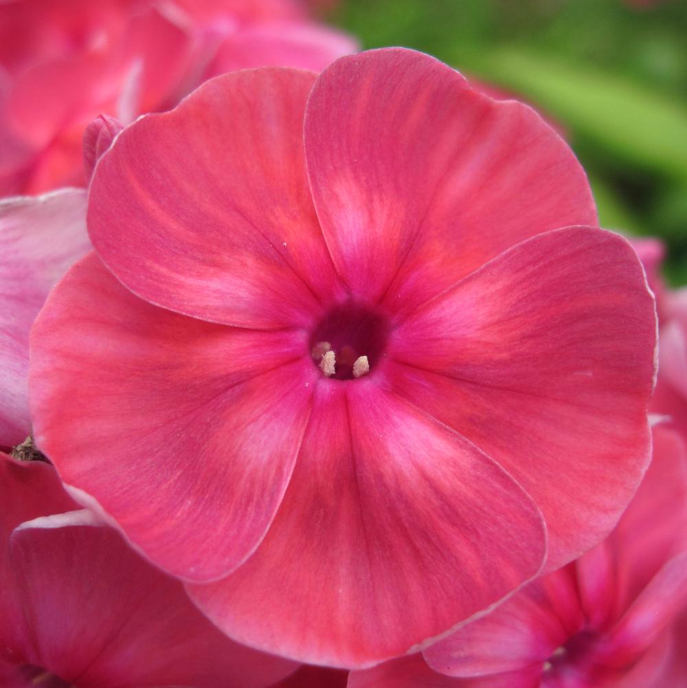 Метельчатый флокс Koralle кораллово-розовый с пепельным налетом по краю лепестков и вишневым глазком. Цветок колесовидный. Соцветие округло-коническое, большое плотное. Куст компактный, прочный. Размер цветка 4.0 см. Высота куста 70-80 см. Срок цветения июль.