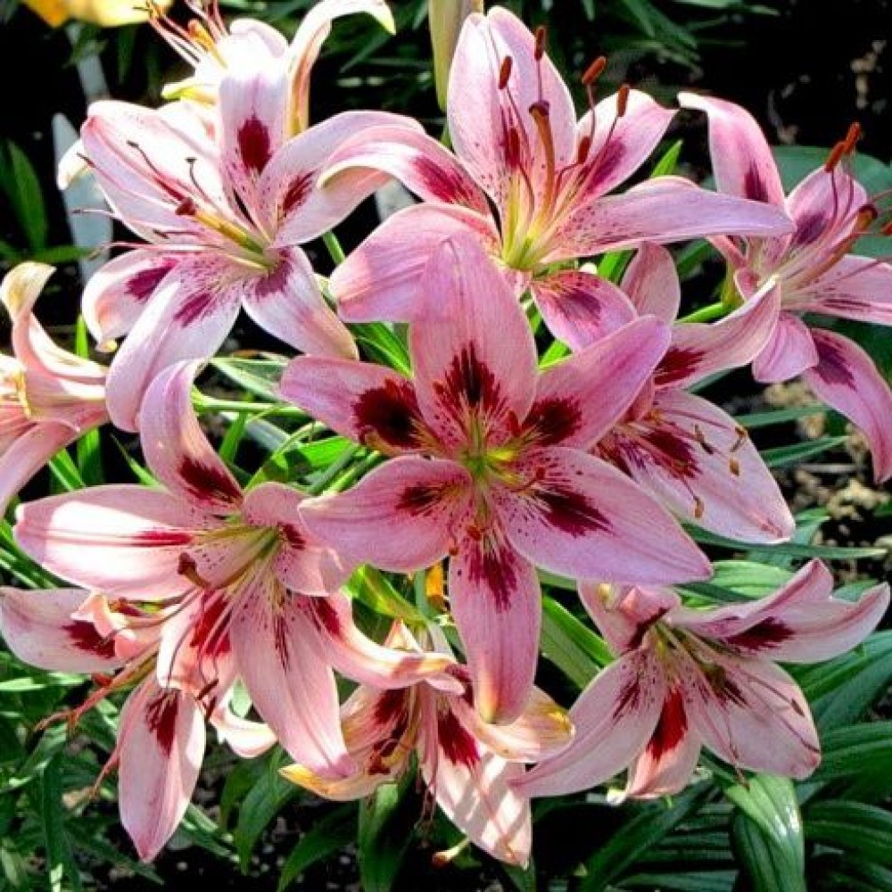 Луковицы Лилии азиатской Леди Элайн (Lilium asiatic Lady Elaine) в период цветения удивят своей привлекательностью и оригинальной расцветкой даже самых искушенных цветоводов. На высоком (до 80 см) цветоносе распускается несколько крупных (14-16 см в диаметре) нежно-розовых цветков с центром насыщенно-бордового цвета. Всю поверхность лепестков россыпью украшают такие же контрастные бордовые крапинки. Отличительной особенностью Леди Элайн является то, что зацветает она намного раньше других сортов лилий. В некоторых регионах начало цветения, Лилия азиатская Леди Элиан может начаться уже в весенние месяцы.<br>