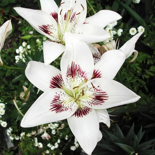 Лилия азиатская Центерфолд (Lilium asiatic Centerfold) удивит многих садоводов. Отличие сорта в необычных цветах. Белоснежные лепестки с узором из прямых фиолетовых линий разной длины и краповых точек ближе к основанию. Размер цветка 15-18 см. Лилия азиатская Центерфолд предпочитает для жизни солнечные или полутеневые проветриваемые места, плодородную дренированную рыхлую почву. Вырастает до 100 см, на каждом стебле 7-9 бутонов, одновременно распускаются 5-7 цветков, поэтому период