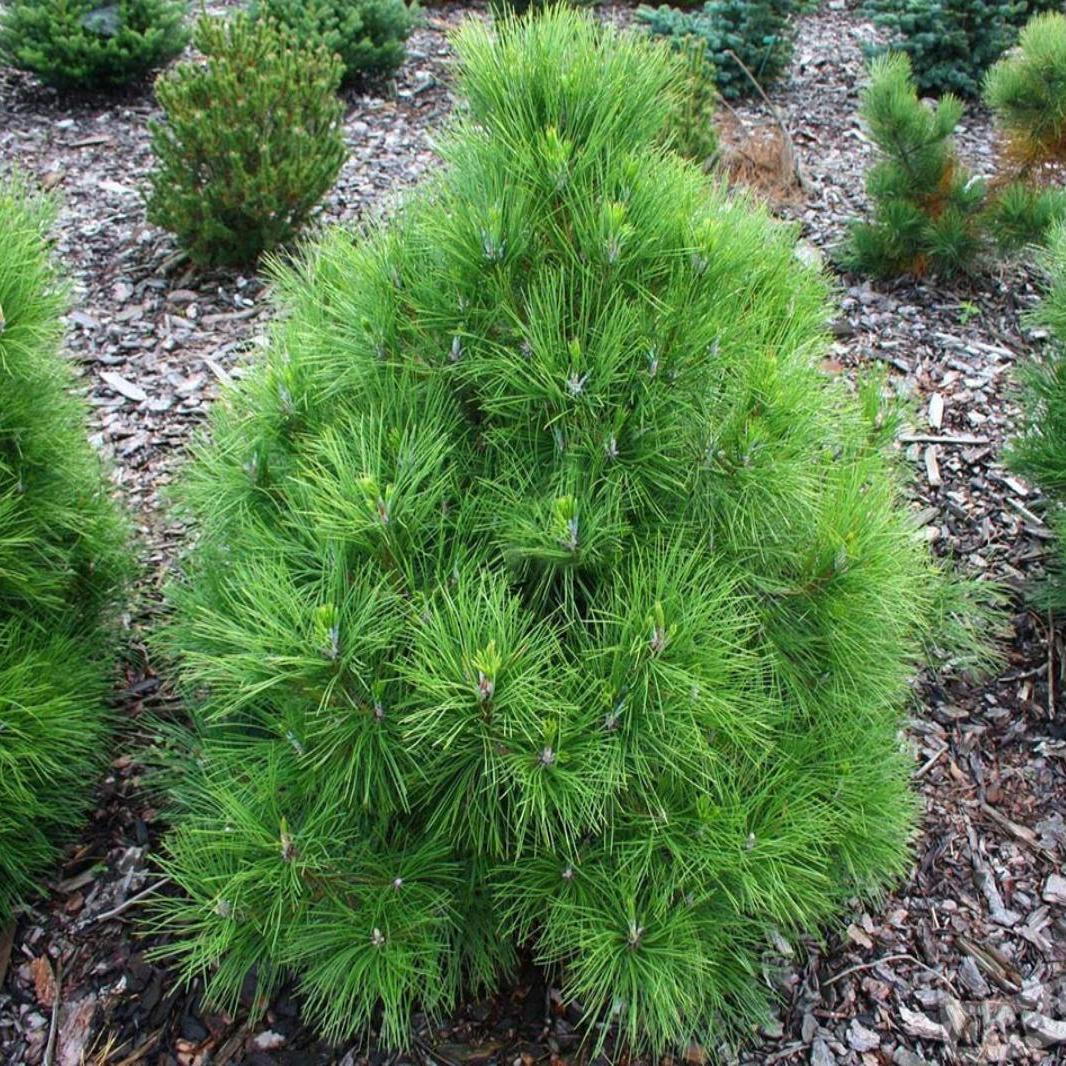 Сосна черная Nana - это карликовая шарокопирамидальная или шаровидная форма с длинными (9см) темно-зелеными иголками, собранными по две. Очень темный хвойный кустарник, практически «черный карлик». Декоративно смотрятся желто-коричневые шишки (4-6см) на темно-зеленом фоне густой кроны. Высота взрослого растения – 3м, диаметр – 4м. Особо ценится сорт за темный цвет хвои и миниатюрный размер, который позволяет растению пережить суровые российские зимы, укрывшись теплым снежным одеялом.