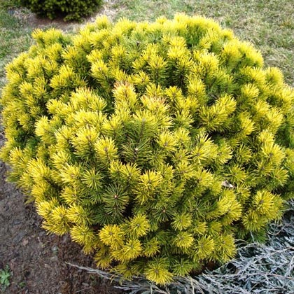 Сосна горная Винтер Голд - карликовая, кустарниковая, медленно растущая форма сосны, достигающая после 10 лет около 0,5 м при диаметре 1 м. Летом хвоя светло-зеленого цвета, зимой золотисто-желтая, собранная по две хвоинки. С наступлением холодов аккуратный светло-зеленый шарик вдруг начинает перекрашиваться в яркий золотисто-коричневый цвет, который сохраняется в течение всей зимы и добавляет оптимизма и тепла в унылый пейзаж. Требования к почве и влаге невысокие. Компактная, морозостойкая, устойчивая к засухе и городским условиям - она станет прекрасным украшением Вашего сада.