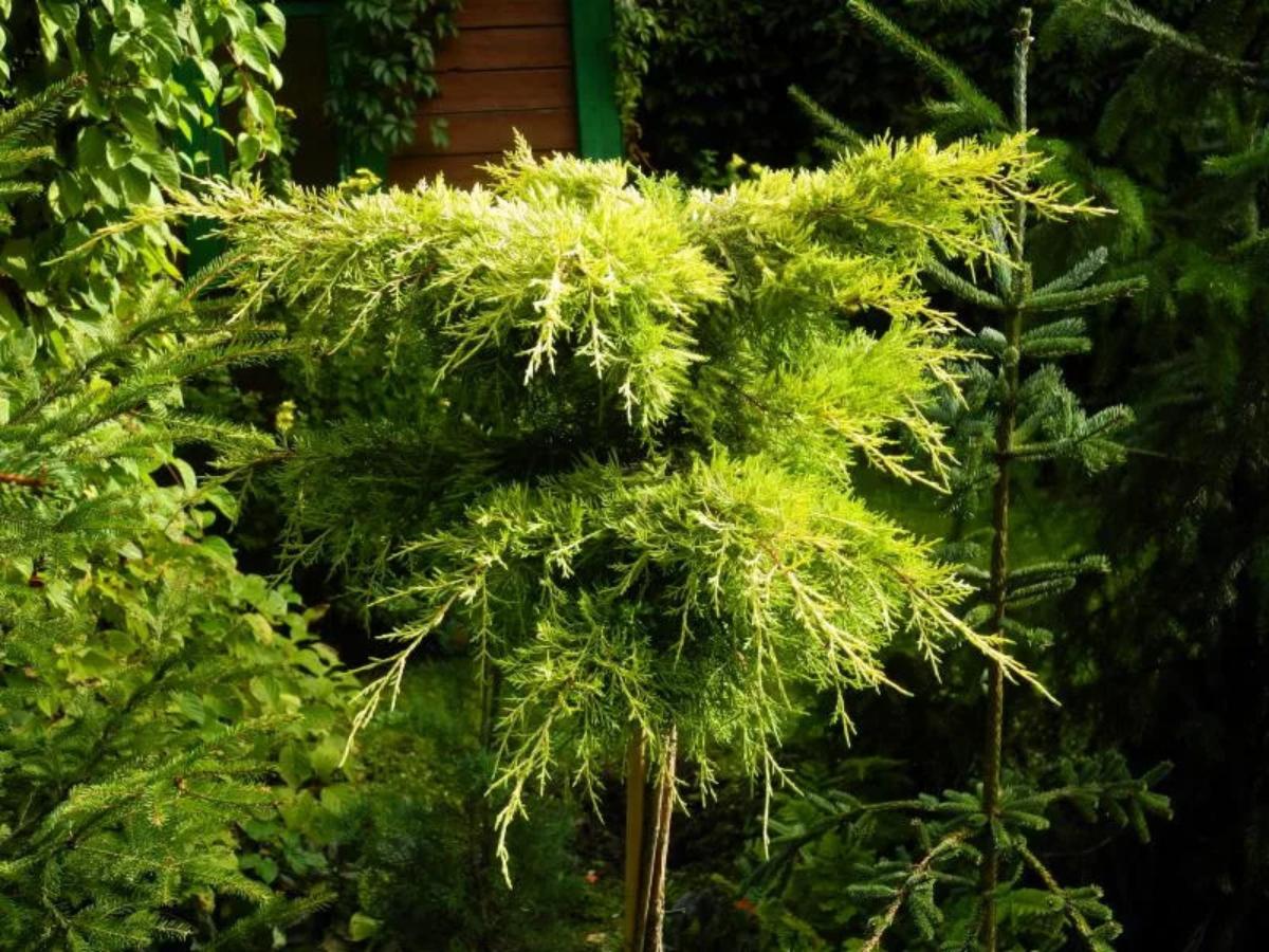 Можжевельник средний или пфитцериана Голден Джой (Juniperus pfitzeriana Golden Joy) - медленно растущая, распростертая форма, высотой 0,5-1м и 1,5 м в диаметре. В 10 лет высота 0,3-0,4 м, диаметр кроны 0,8-0,9 м. Растет Можжевельник пфитцериана Голден Джой медленно. Побеги изгибаются дугообразно, образуя каскады. Отличается яркой золотисто-желтой окраской молодых побегов, которая сохраняется в течение всего года. Позднее хвоя становится светло-зеленой. Требования к почве и влаге низкие. Можжевельник пфитцериана Голден Джой предпочитает солнце, полутень. Для более яркой окраски рекомендуется солнечное положение