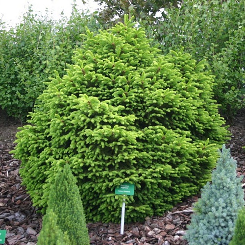 Взрослое дерево достигает 2 м в высоту и около 3 м в ширину. Ветки близко расположены друг к другу и слегка приподняты, формируют плотную, изящную крону. Крупномер обыкновенная Pygmaea растет очень медленно, прирост не превышает 8 см в год. Побеги укрыты густой, игольчатой хвоей ярко-зеленого оттенка. Саженцы не боятся сильных морозов, хорошо развиваются как на солнечных участках, так и в немного притененных. Ель используют в одиночных посадках или в ландшафтных композициях.